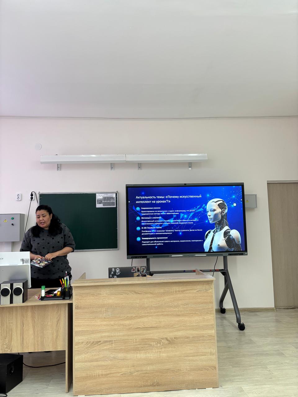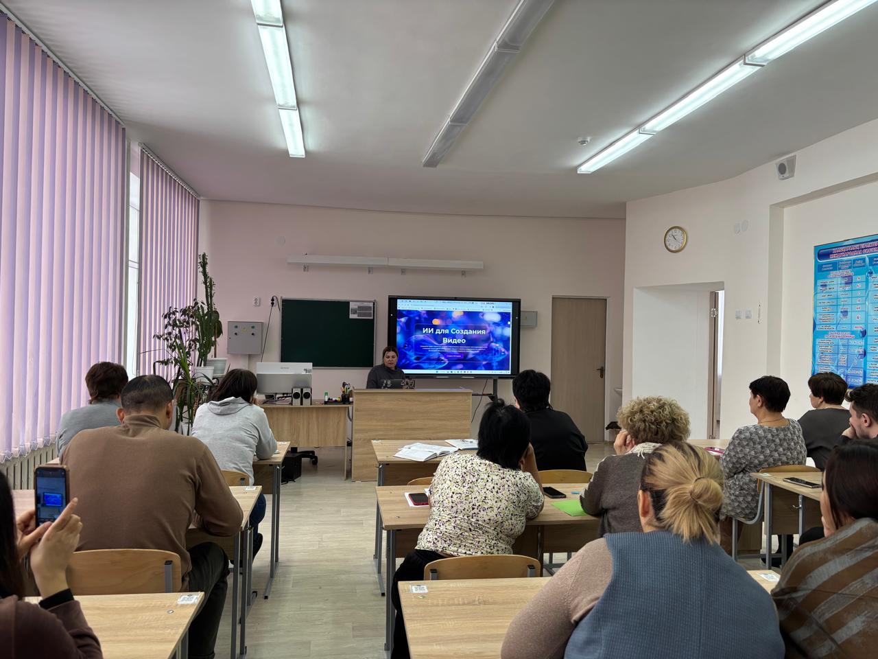 Әріптестеріміз, Лариса Владимировна мен Конысбай Сеилович мектеп мұғалімдеріне жасанды интеллектті қолданудағы білімдерімен және мүмкіндіктерімен, мектеп оқушыларының ынтасын арттыруға арналған пайдалы сайттармен, сонымен қатар оқу үдерісін бұдан да заманауи ету жолдарымен бөлісті. Мастер-класс интерактивті дәріс және топпен тәжірибелік жұмыс түрінде өтті, мұғалімдер презентациялар жасауға, оларды дауысқа салуға, уақытты үнемдеу мақсатында сабақ құру, мәтіндер жинақтауға жаттықты. Танымал қызметтерді пайдалану мысалдары көрсетілді: ChatGPT, Canva AI, Google Bard, Quizlet AI. Мастер-класс пайдалы және тиімді өтті. Мұғалімдер өз жұмысында нейрондық желілер мен жасанды интеллектті пайдалану туралы жаңа түсініктермен білім қорын кеңейтті. Соңғы финал қорытындысы: «Жасанды интеллект мұғалімді алмастырмайды, бірақ оның жұмысын жеңілдетіп, қызықты етеді!»