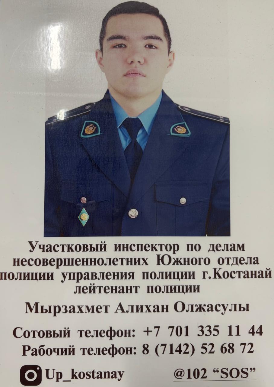 Қостанай қаласы полиция басқармасының Оңтүстік полиция бөлімінің кәмелетке толмағандар жөніндегі учаскелік инспекторы полицияның аға лейтенанты Жанаргүл Маратқызы Шәріпова.