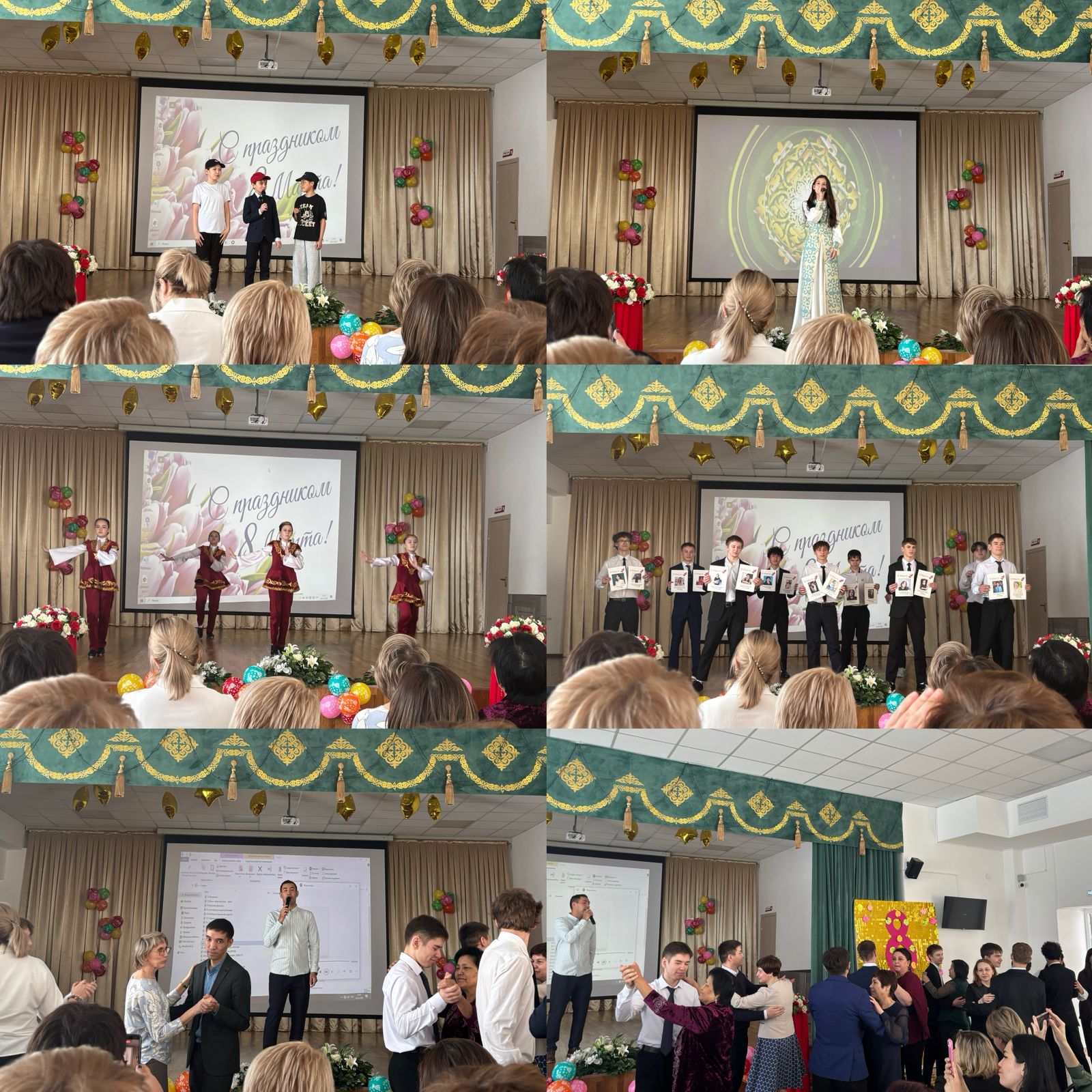 6 наурыз 2026 жылы мектепте Халықаралық әйелдер күні — 8 наурыз мерекесіне арналған мерекелік концерт өтті. Таңертеңнен бастап мектепте жылы әрі мерекелік көңіл-күй орнады. Барлық әйелдерді оқушылардан құралған «тірі дәліз» қарсы алып, педагогтар мен мектеп қызметкерлерін келе жатқан мерекемен құттықтады. Жылы лебіздер мен әуезді музыка шырқалып, баршаға көтеріңкі көңіл-күй сыйлады. Құттықтау сөзбен мектеп директоры Кандалина Т.В. сөз сөйлеп, барлық әйелдерді көктемнің, сұлулық пен нәзіктіктің мерекесімен құттықтады. Ол баршаға зор денсаулық, бақыт, амандық және еңбектеріне табыс тіледі. Оқушылар ер мұғалімдермен бірге жарқын әрі қызықты концерттік бағдарлама дайындады. Бұл күні сахнадан әйелдер қауымына арналған алғыс сөздер мен жылы құттықтаулар айтылды. Оқушылар ән айтып, әсерлі өлеңдер оқып, көрермендерді әсем билері мен шығармашылық нөмірлерімен қуантты. Мерекелік концерт жылы әрі достық атмосферада өтіп, барлық қатысушыларға көтеріңкі көңіл-күй мен жағымды әсер сыйлады. Көрермендер өнер көрсетушілерді зор қошеметпен қолдап отырды. Мерекелік концерттің соңында мектеп педагогтары мен қызметкерлері үшін мерекелік шай дастарханы ұйымдастырылып, жылы әрі еркін жағдайда барлығы бір-бірімен әңгімелесіп, әсерлерімен бөлісіп, тағы да көктемнің әсем мерекесімен құттықтады.