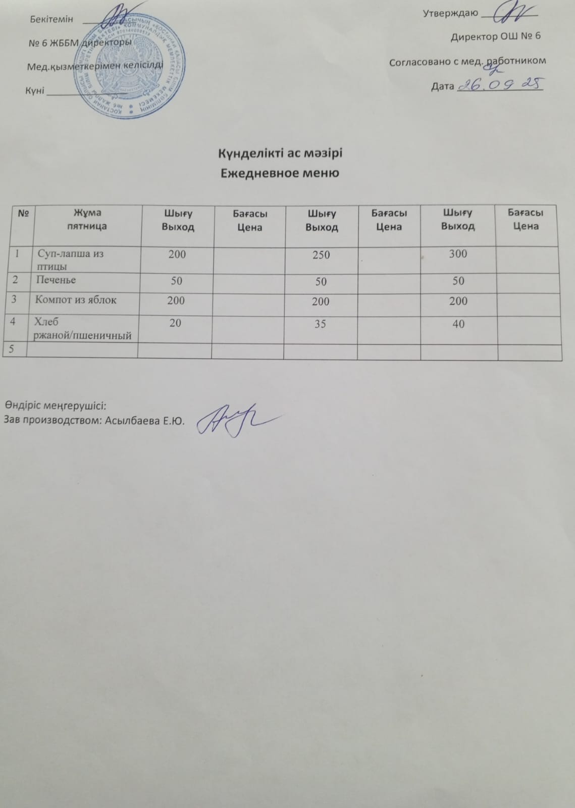 Меню на 26.09.2025